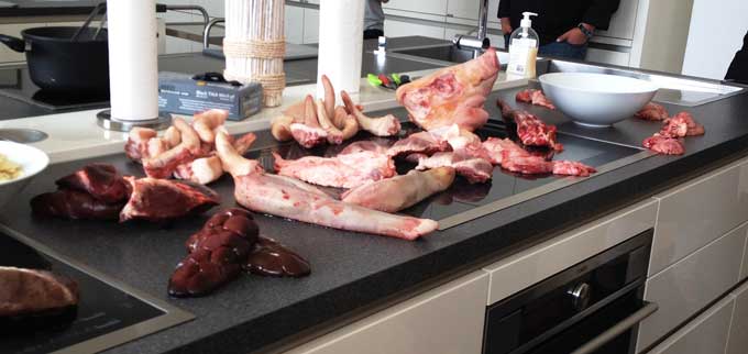 In der Küche erwarte uns dann ein etwas ungewöhnliches Zutaten-Set, das der eine oder andere sicherlich zum ersten Mal so sah. (Fast) die ganze Palette von Tier-Innereien lag bereit zur Identifikation.