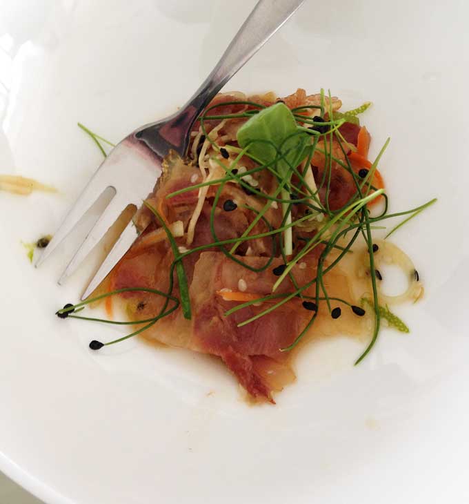 Damit wir nicht hungrig an den Start gehen mussten, gab es schon die erste Kleinigkeit zum Essen: einen sehr schön asiatisch angemachten Ochsenmaulsalat. Schöner Start!