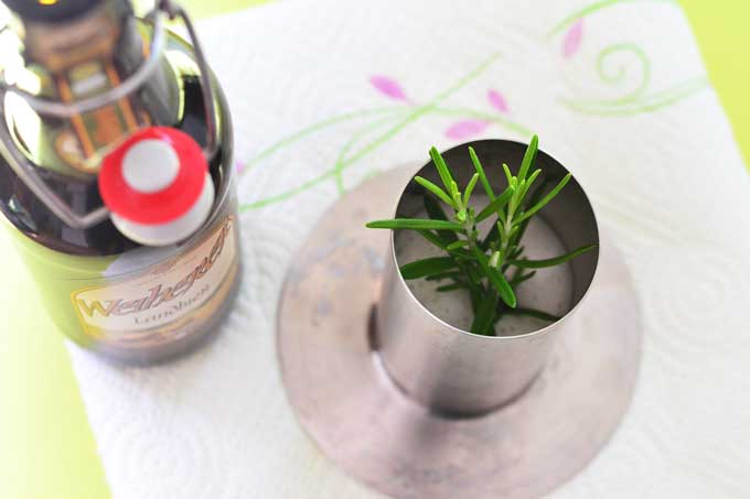 Der Behälter wird nun halbvoll mit Flüssigkeit gefüllt, also ganz normales Bier. Übrigens kann man hier wieder wild experimentieren, auch Cider, Apfelsaft, Weißwein etc. kann man mal ausprobieren. Ein paar Kräuter können auch nicht schaden. Ich habe noch einige Zweige Rosmarin mit reingesteckt. Fertig!
