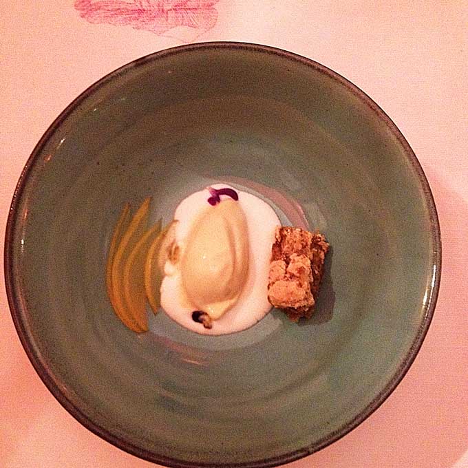Vor diesem Hintergrund ist das präsentierte erste Dessert etwas enttäuschend. Mit Kefir und Eis ist die cremige Textur des Eiweißes dominant, die Birne zu schwach (und auch zu unmotiviert kombiniert).