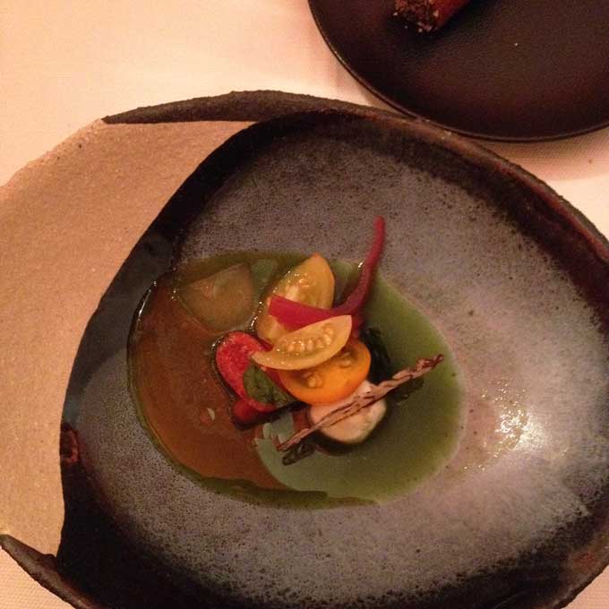 Das Meer läßt grüßen, jodig auch durch den Queller und die berühmte selbst im Hiša Franko hergestellte Fischsauce. Die Kombination dieser starken und eindeutigen Aromen mit der gerösteten Paprika (rauchig-süßlich) ist für mich ein exemplarische Beispiel an dem man erkennen kann, dass Ana Roš keine klassiche Kochausbildung genossen hat.