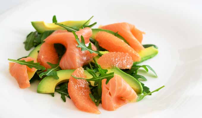 Die Avocado ist in diesem Salat ein Brückenbauer – vom Lachs hin zum Gemüse. Ich unterstütze das Avocado-Aroma noch zusätzlich durch die Verwendung von Avocado-Öl. Eigentlich ein Geheimtipp, Avocado-Öl passt eigentlich immer zu Gemüse und Salat, das ist mal eine sinnvolle Alternative zum allgegenwärtigen Olivenöl.