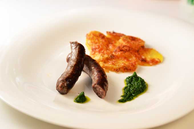 Lammbratwürste mit Brennessel-Pesto und Kartoffelgratin
