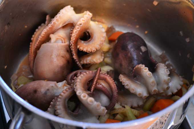 4. Nach ca. 5 Minuten mit Weißwein ablöschen, kurz aufwallen lassen und mit Wasser auffüllen (so dass der Pulpo bedeckt ist)