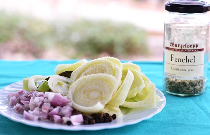 1. Fenchel & Zwiebel in feine Scheiben bzw. Würfel schneiden.