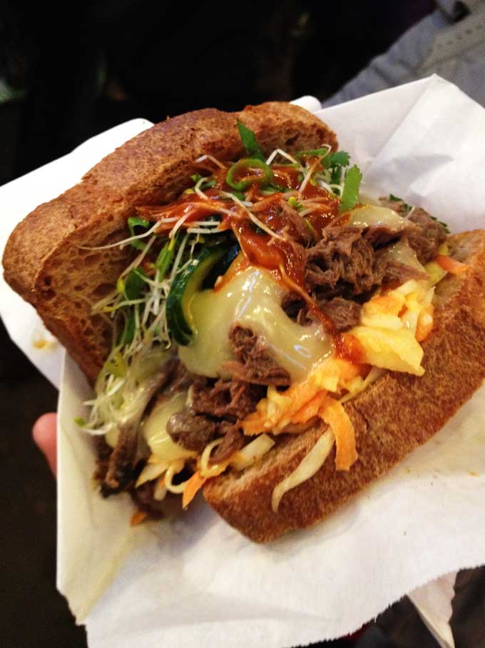 Die Kurzbeschreibung der Zutaten sagt alles: Hausgebackenes Dinkel-Vollkornbrot, 200 Stunden Beef von der Freilandkuh, Coleslaw, Gurken-Kimchi, Sprossen-Frühlingszwiebel-Koriander-Mix, japanische Mayonnaise. Eine Portion für 7,- €.