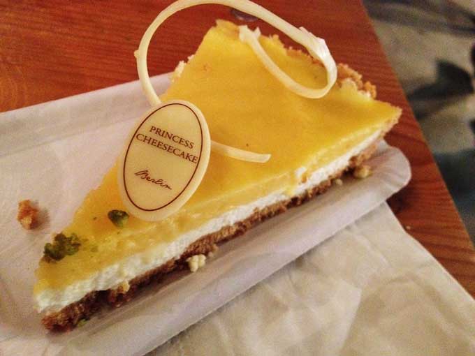 Nach all den herzhaften Aromen ist eine süße Köstlichkeit genau das Richtige. Der Lemon Cheesecake der Konditorei Princess Cheescake war unser Dessert (naja für mich das Pre-Dessert: danach holte ich mir noch eine Kugel echtes Pistazieneis…). Geschmacklich sehr gut, aber der Mürbteigboden war nicht so ganz perfekt, zu dunkel und dadurch etwas zu hart. Mit dem Plastikgäbelchen sehr schwer zu essen. Ein Stück für 4,- € (die Kugel Pistazieneis kostete 1,50 €).