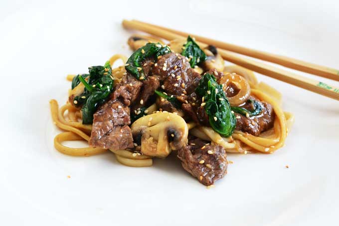 Das Rezept: Udon-Nudeln mit Hochrippe und jungem Spinat